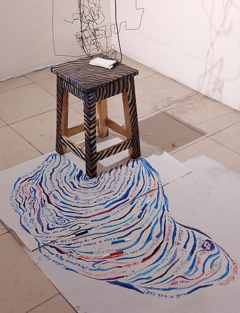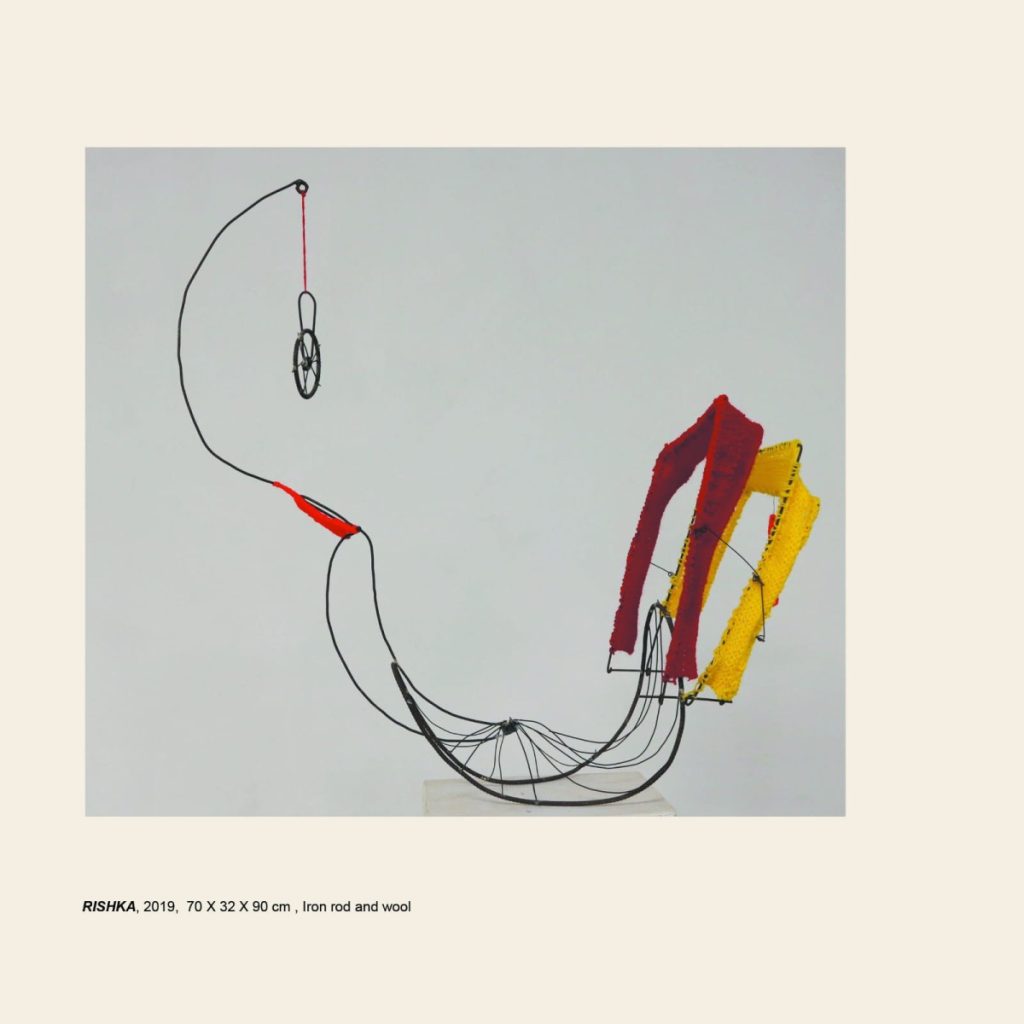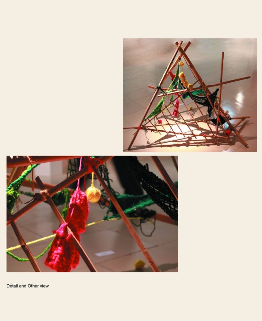 Short Bio : Susmita Mukherjee Misty (b. 1996) is a visual artist, based in Dhaka. She completed her BFA in 2017 and MFA in 2019 from the Department of Sculpture, Faculty of Fine Arts, University of Dhaka. Misty’s work evolves from her very personal experiences. Thoughts and feelings from ordinary incidents of daily life are the initial inspiration for her artwork. Various opposing situations and conflicts of life become the main characteristics of her works with the balanced depiction of heavy and light, hard and soft, light and dark, bright and opaque. Misty uses unconventional and recycled materials such as wool, bamboo, cloth, rope, and polythene to create works inspired by her surroundings from the old part of Dhaka. Her practice often blurs the line between sculpture and installation, expanding the possibilities of form and material. Her first solo exhibition, “Panchmishali (Unsorted)”, was held at Kala Kendra, Dhaka in 2024. She has also participated in the 4th, 5th and 6th National Sculpture Exhibition (2018, 2021, 2024). Moreover, Susmita has taken part at 21st, 22nd and 23rd Young Artist Art Exhibition (2018, 2020, 2022) and she received the Honorable Mention at the 21st, then the Best Award in Sculpture at the 23rd edition. Nowadays, she is one of the members of Britto Arts Trust and simultaneously she is teaching at Gandaria Kisholoy Kochi-Kanchar Mela as well.