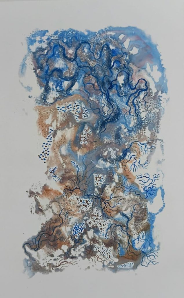 The philosophical underpinning of Bobby’s practice aligns with the writings of Maurice Merleau-Ponty, who proposed that perception is an intertwining of body and world — that vision is not detached observation but lived participation. Bobby’s imagery, rooted in eco-phenomenology, performs this intertwining. Her engagement with the vegetal — the “roots and veins of the planet” — mirrors the plant-thinking philosophy of Michael Marder, where plants embody nonviolent resilience through quiet adaptability. In Bobby’s art, this vegetal intelligence translates into form: her stillness grows, rather than asserts.